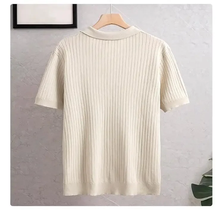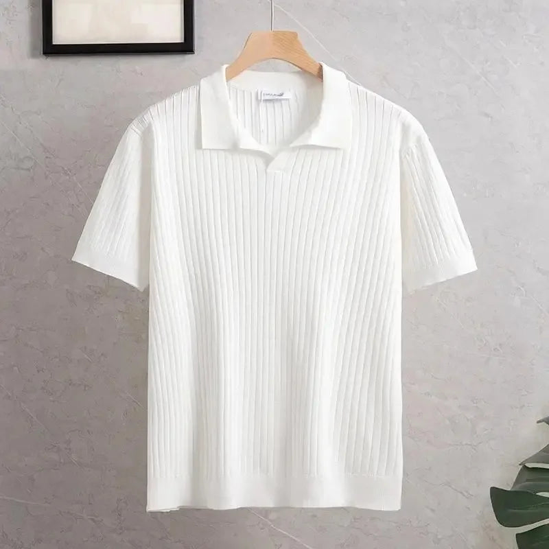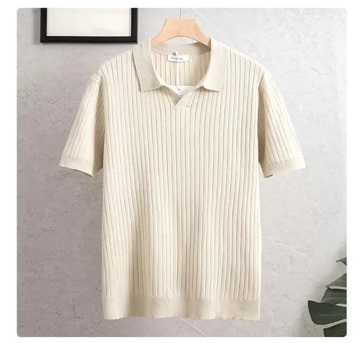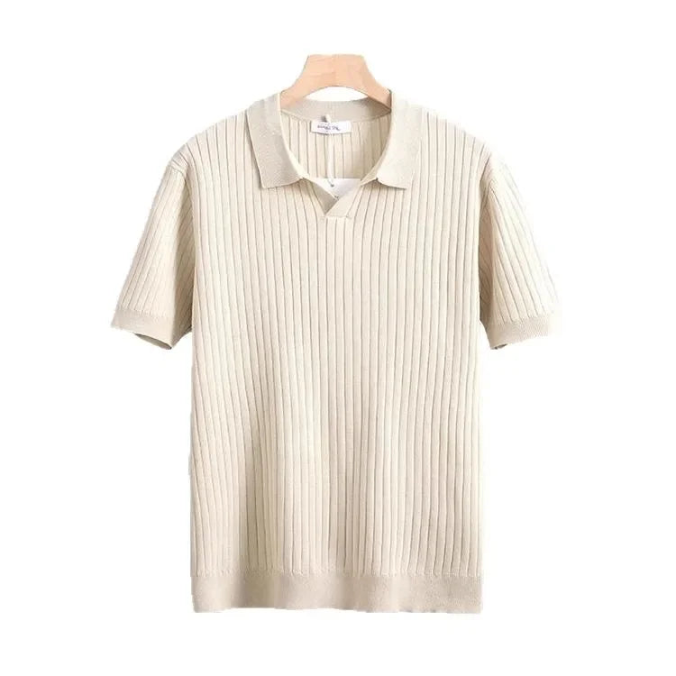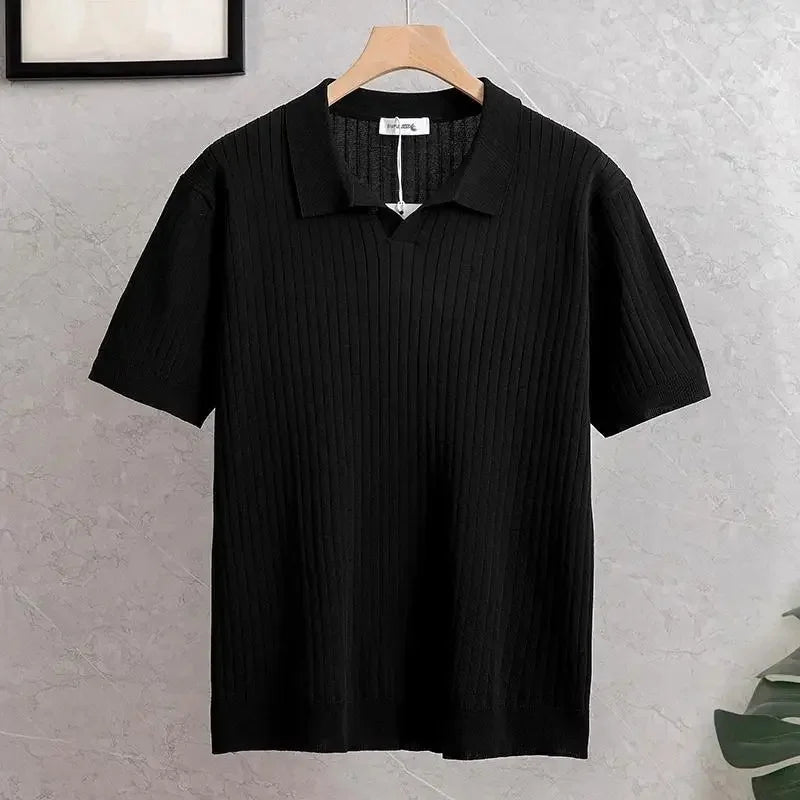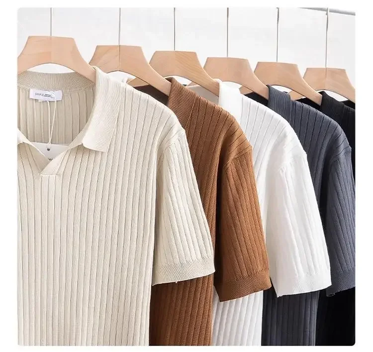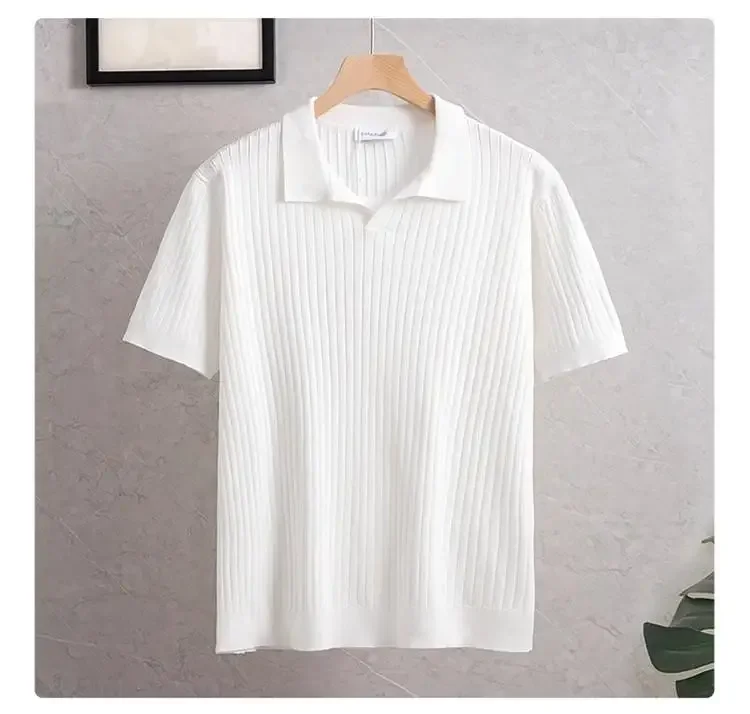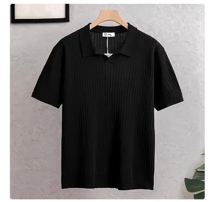 New Summer Men's Knitted Light Business Casual Fashionable Striped Silk Polo Shirt Half Open Collar Versatile for All Occasions